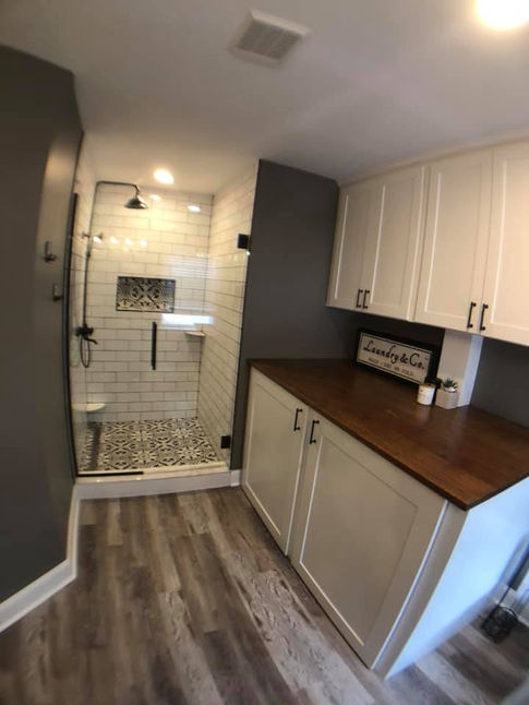 Making the shower larger but same location, keeping the vanity same location but updating, relocating the toilet and adding a washer and dryer to the master bath on the second floor. We also did custom cabinetry with a custom wood top. Once again the customer choosing the tile and fixtures made this job come together beautifully.